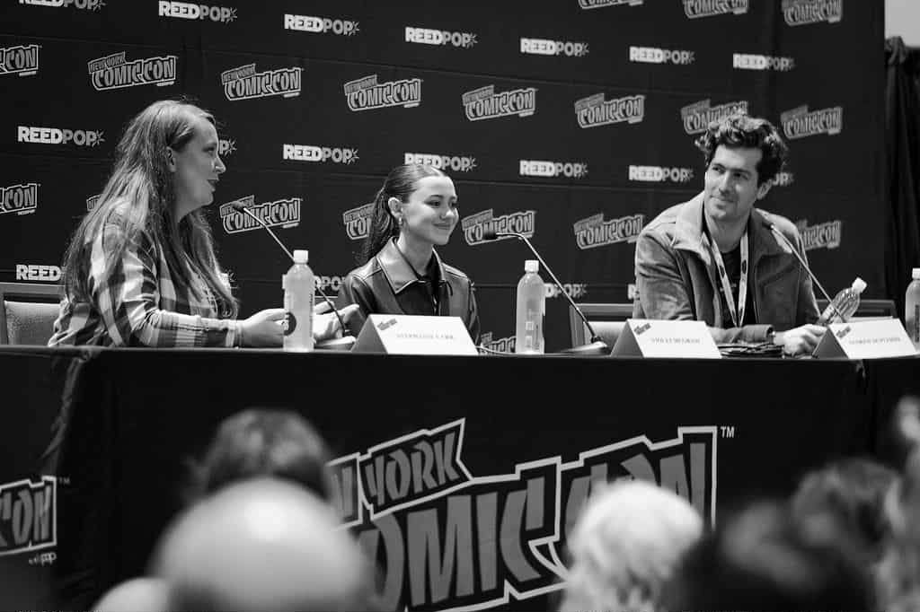 While Parish and Sherwood were unable to attend NYCC as previously announced due to the weather, Duplessie and McGraw fielded audience questions about the film, their prior work, and their creative processes. Duplessie revealed they refered to McGraw as “One-Take Violet” by the end of the shoot due to her ability to nail what they were looking for on the first try. That’s in contrast to Sherwood’s ability to smoothly hammer a nail into the floorboard, which Duplessie and McGraw said involved several takes, including at least one where Sherwood hit his hand.